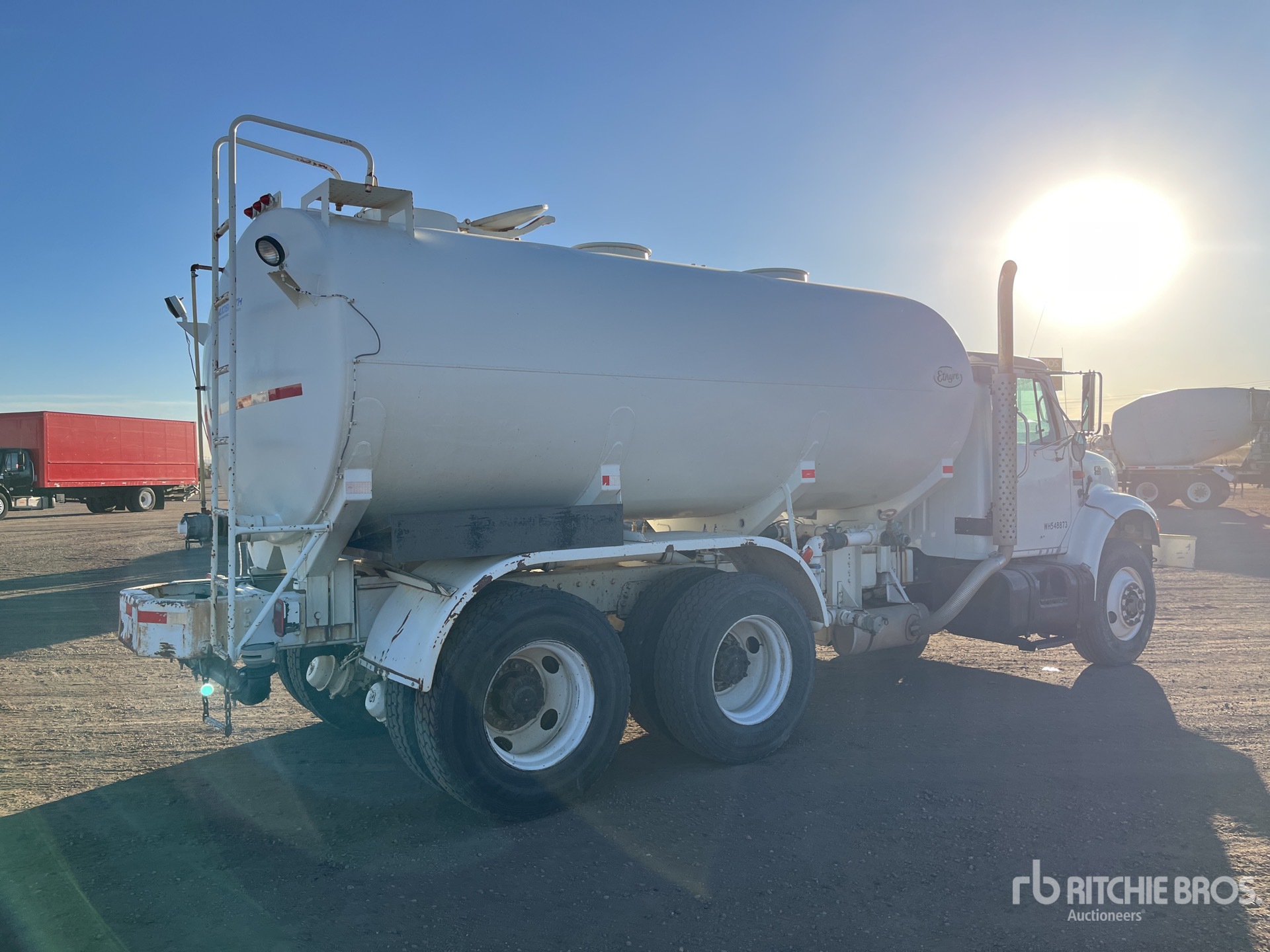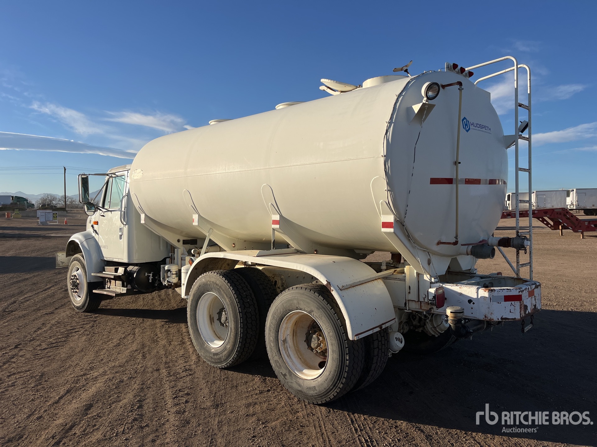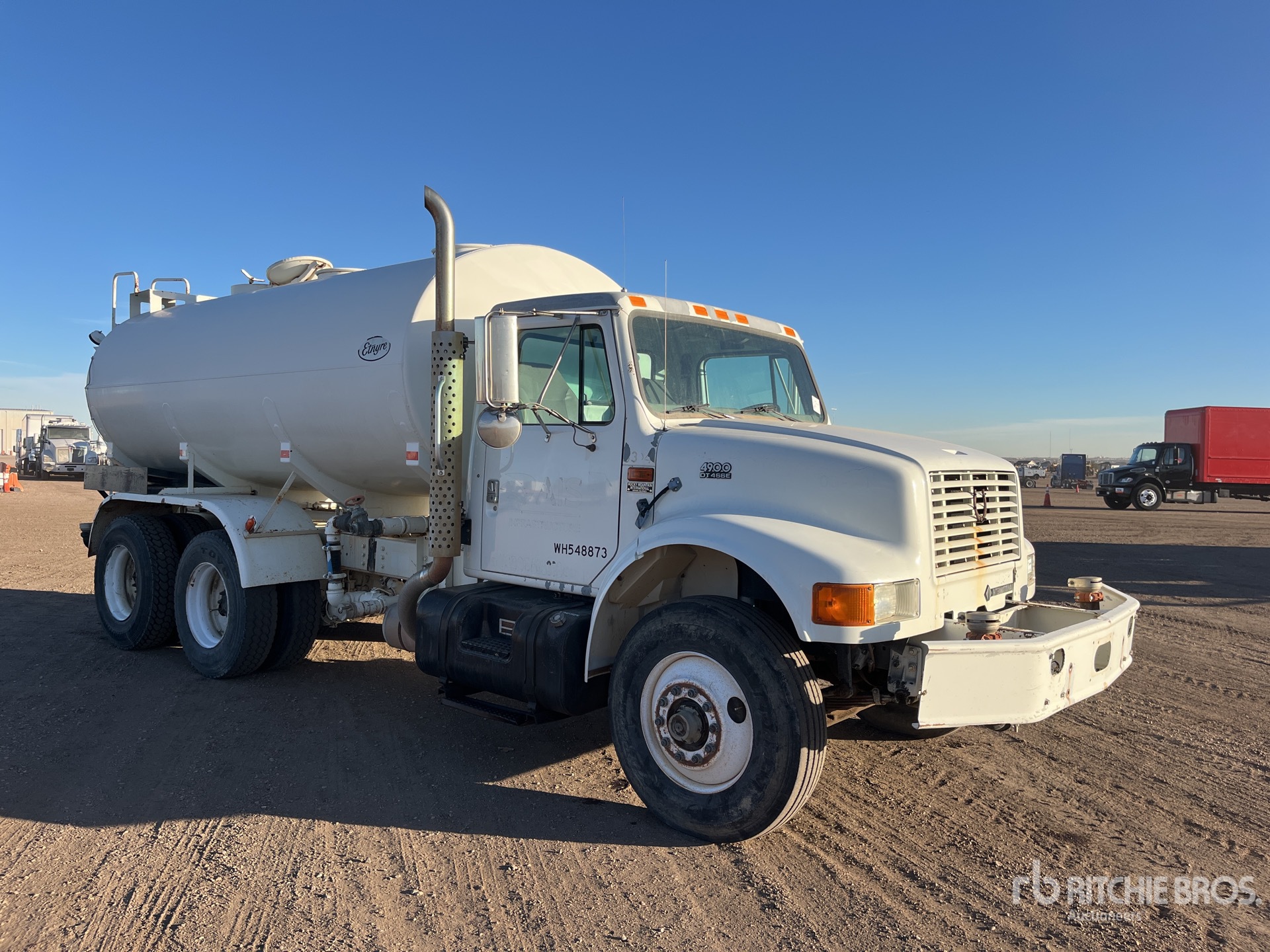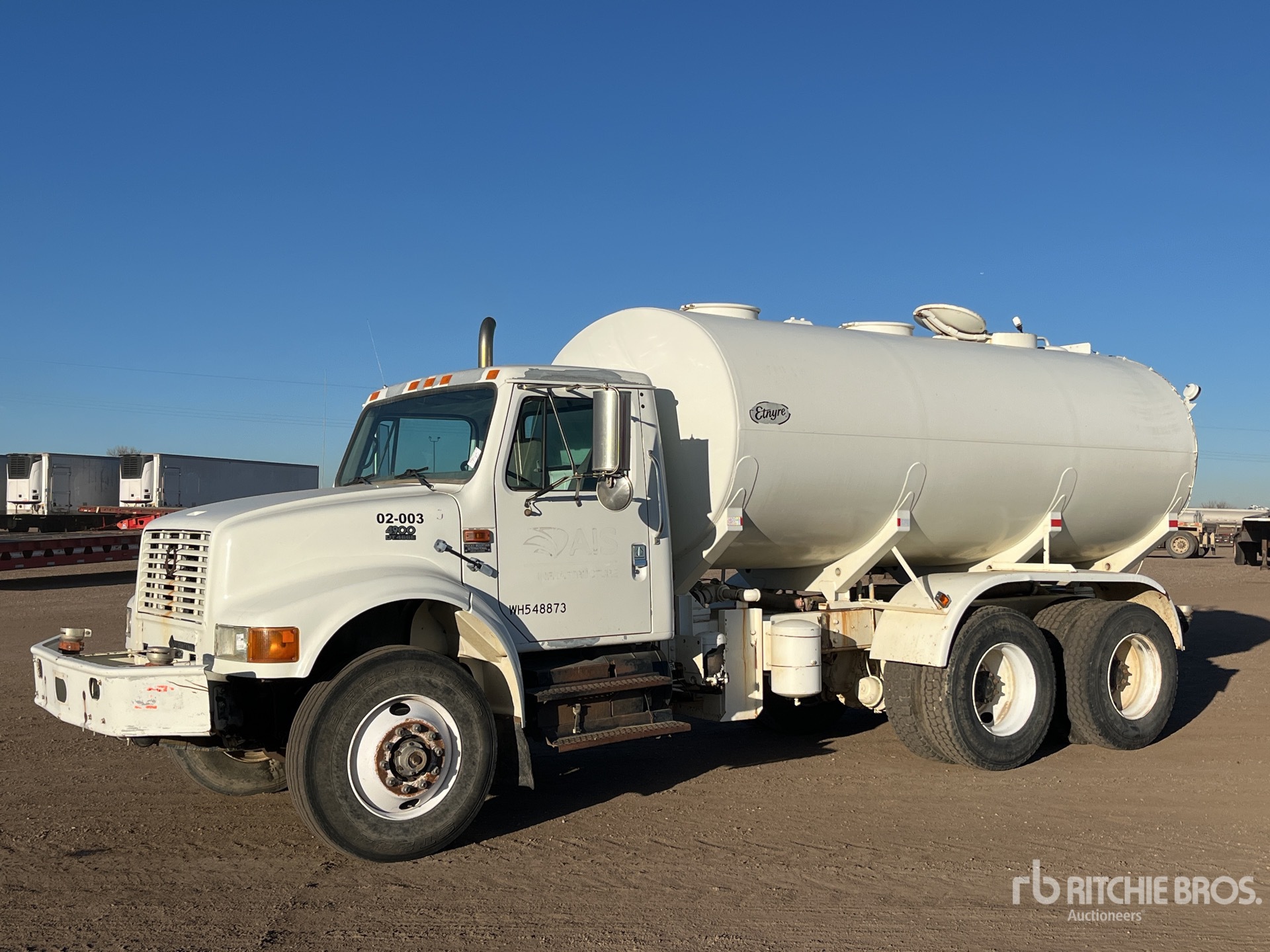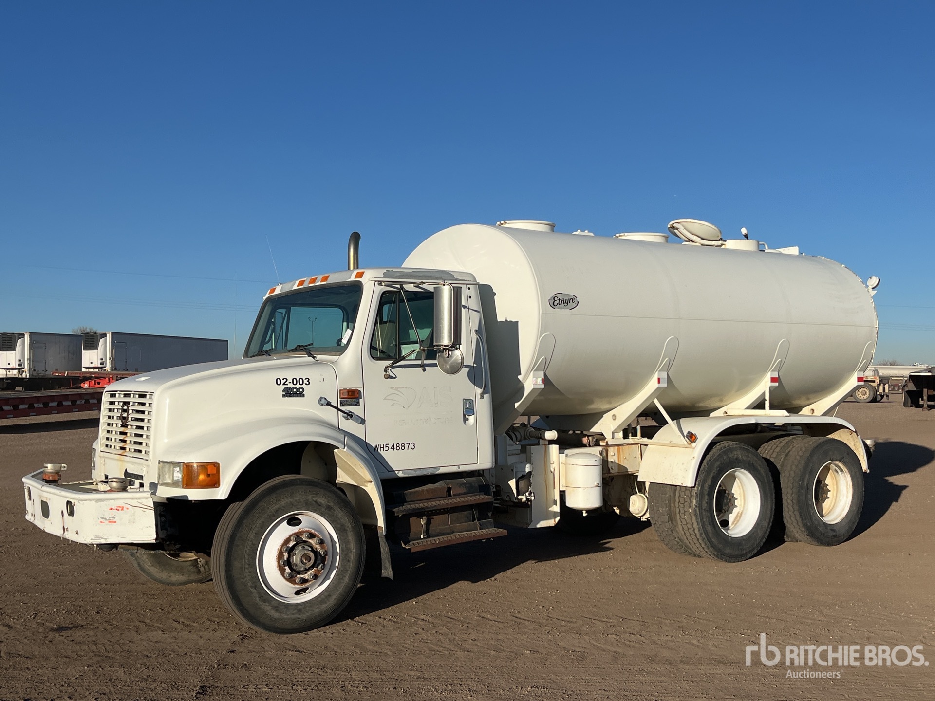 Located in Lane 8 Spot 40, International DT466 6 Cylinder 7.6 L Diesel 250 hp Engine, 1997 US EPA Label, 4780 Engine hrs, Automated Transmission, 12350 lb Front Axle, 40000 lb Rears, 52350 lb GVWR, 11R22.5, Dual Steering Boxes, Double Frame, Hendrickson RT/RTE Series Spring over Walking Beam Suspension, 190 in Wheelbase, PTO, Etnyre Flusher Tank, PTO Driven Pump, 6 ft, Spray Bar, Front Spray, Rear Spray