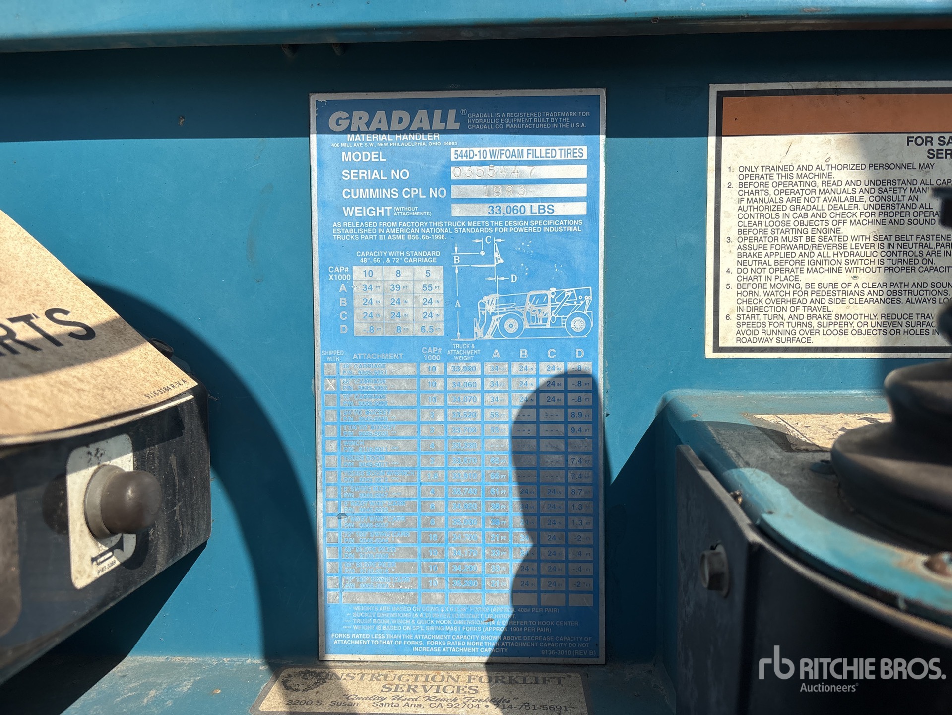 The detailed equipment information is limited in scope, and Ritchie Bros. Auctioneers has not inspected any aspects or components of the equipment other than those expressly set forth herein. Unless expressly stated, we make no representations or warranties, express or implied, concerning the equipment or its components, including without limitation any representations or warranties concerning functionality, conformity or compliance with any safety standard or requirement of any applicable authority or regulatory body, fitness for any particular purpose, or merchantability. You are strongly advised to perform your own detailed inspection of the equipment prior to bidding.