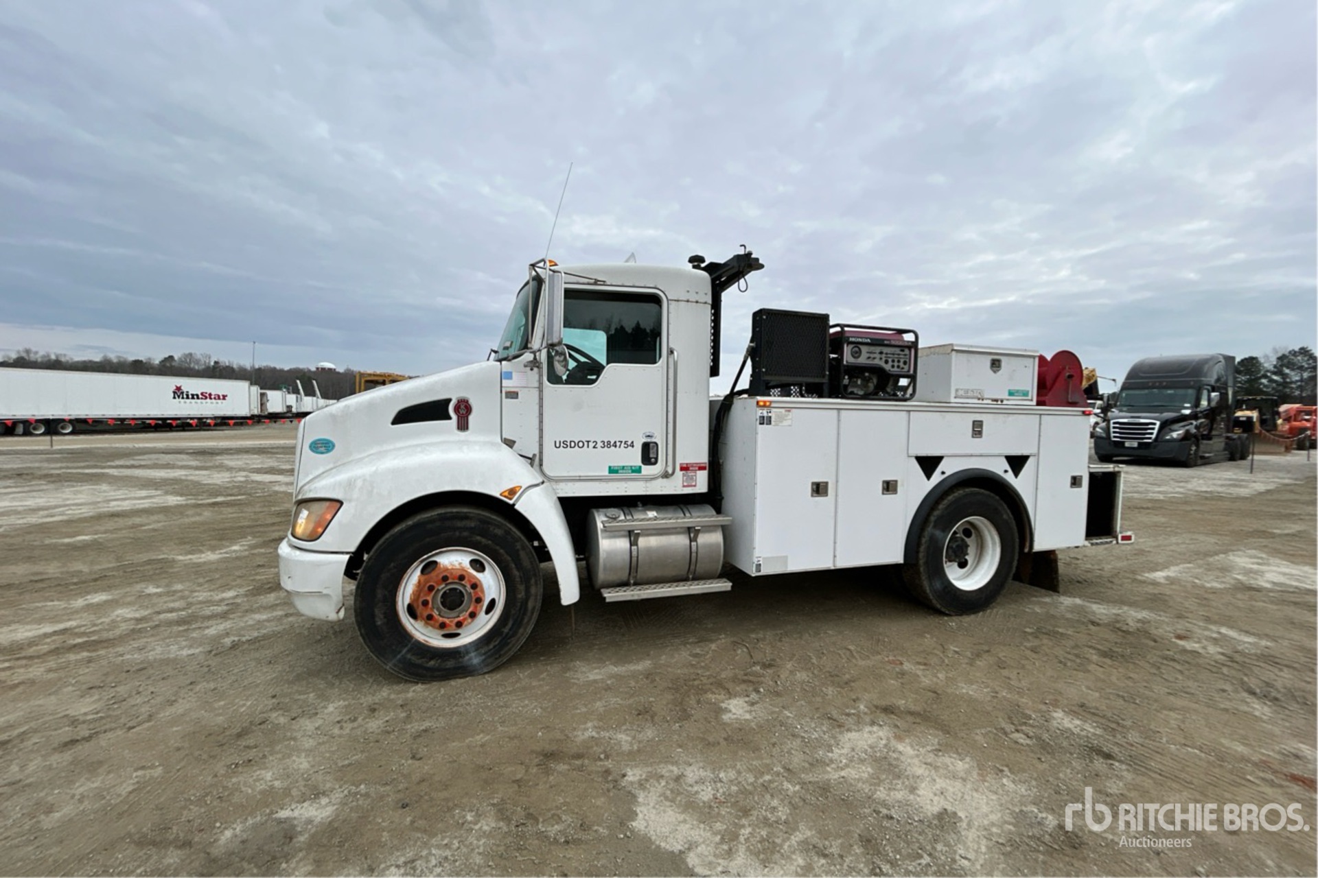 Paccar PX6-260 6 Cylinder 6.7 L Diesel 260 hp Engine, 2008 US EPA Label, 5974.6 Engine hrs, Engine Brake, Allison Automated Transmission, 12000 lb Front Axle, 21000 lb Rears, 33000 lb GVWR, 11R22.5, Spring Suspension, 152 in Wheelbase, PTO, 2018 Omaha 12 ft 9 in Body, Honda EM 5000SX 5 kVA Gasoline Generator Set