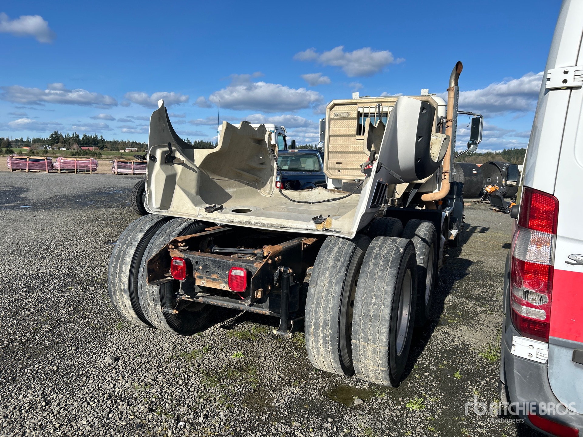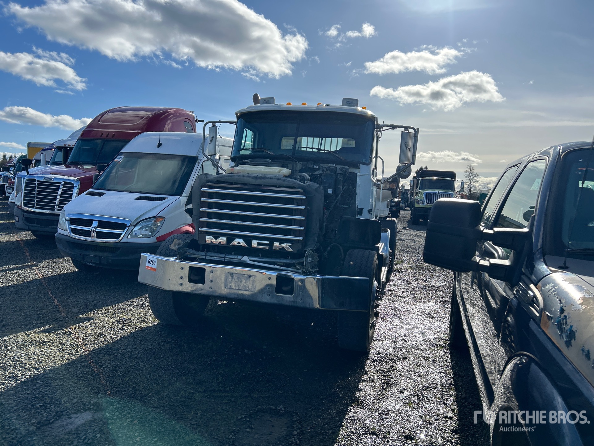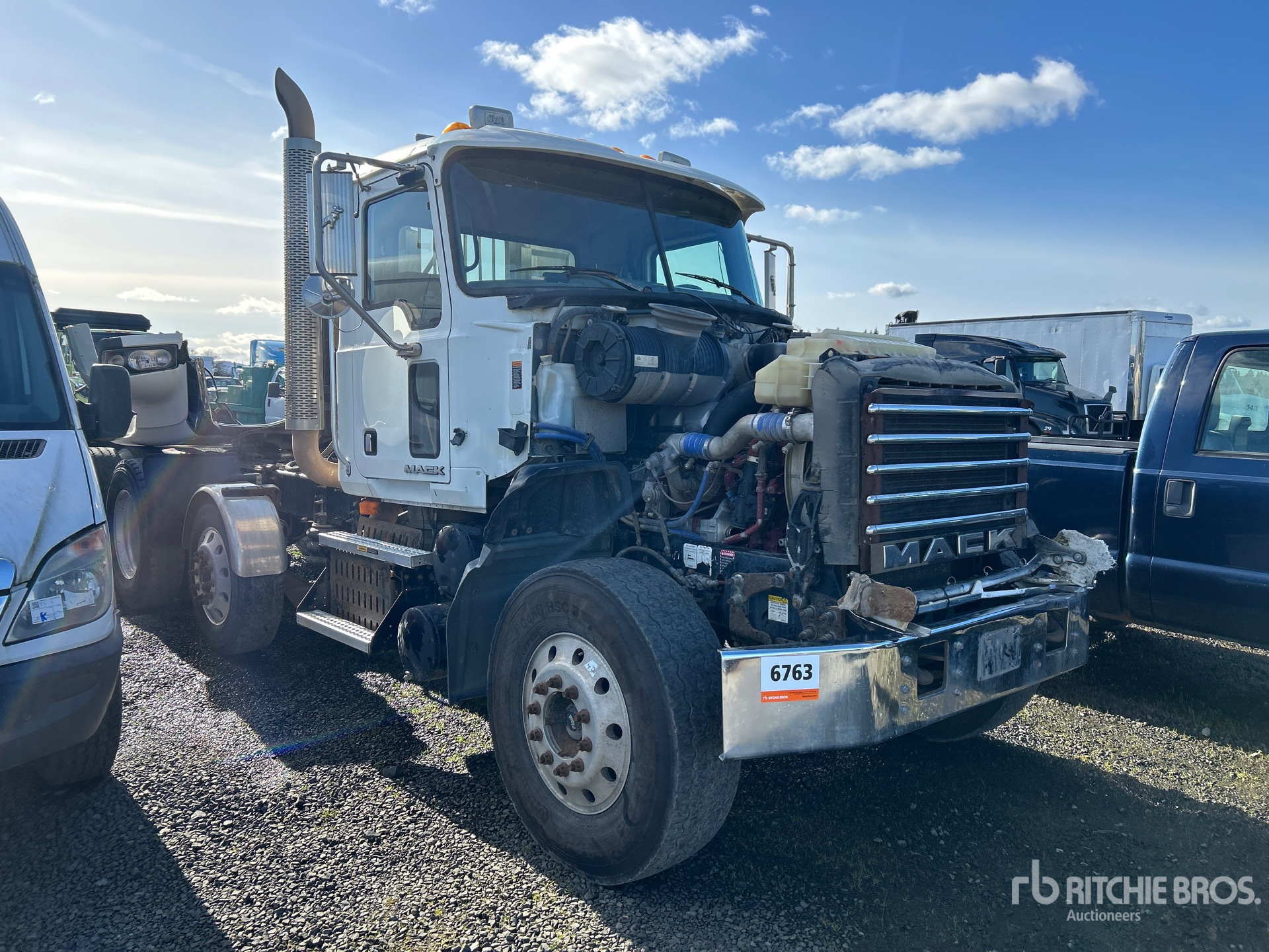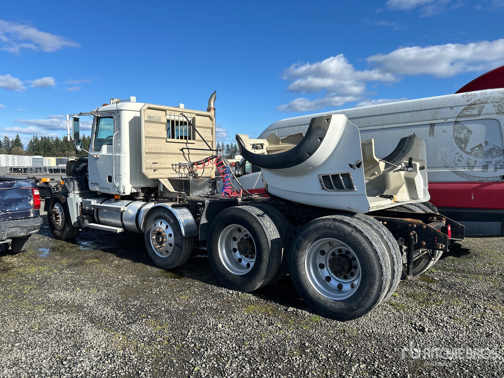 Mack Engine, Mack Manual Transmission, 13220 lb Front Axle, 44000 lb Rears, 57220 lb GVWR, 228 in Wheelbase, Air Suspension, Air Lift Pusher Axle, Aluminum Wheels, 315/80R22.5 Front Tires, 11R24.5 Rear Tires, Wet Kit, Air Sliding 5th Wheel, Headache Rack