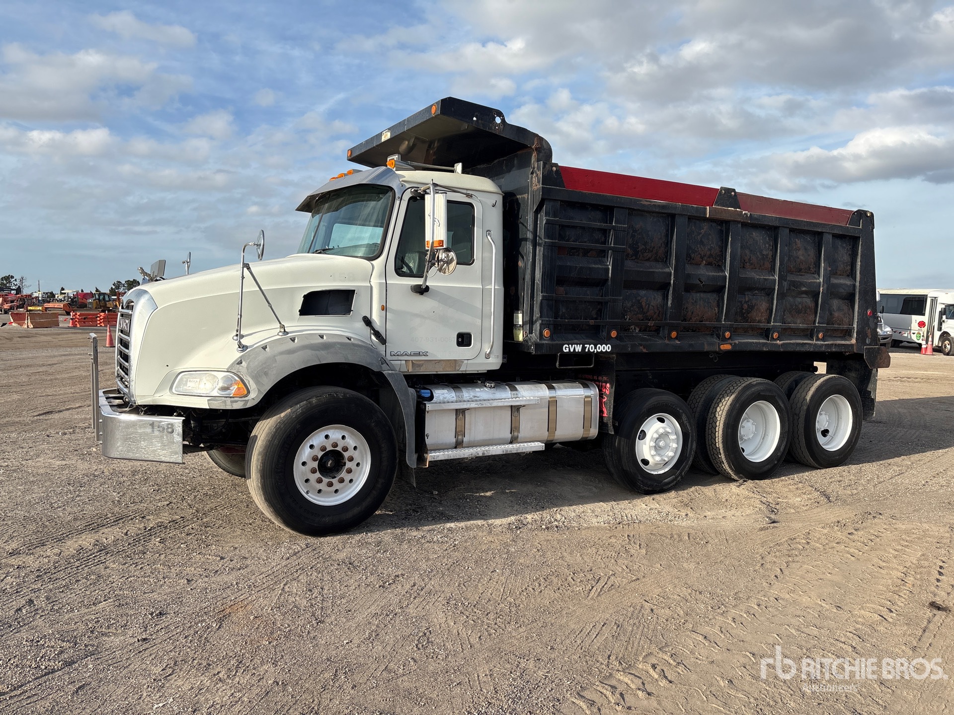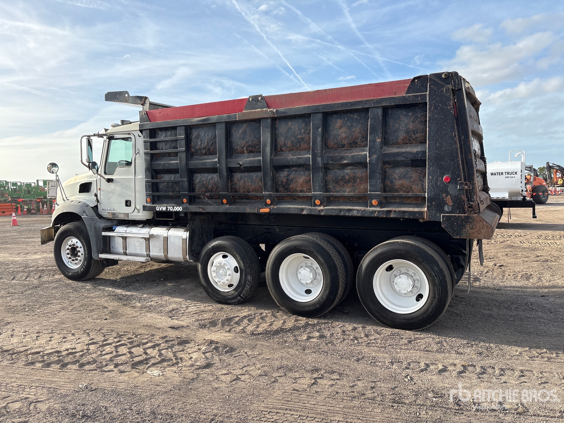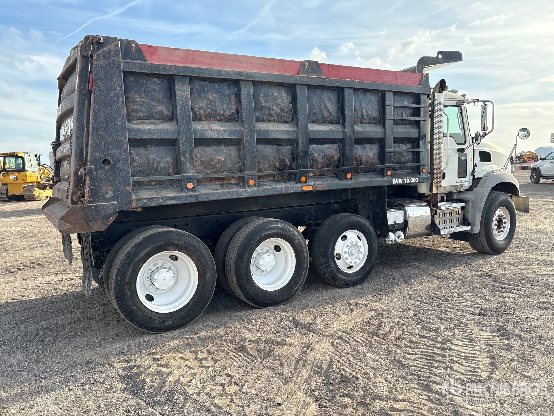Mack MP7 6 Cylinder 10.8 L Diesel 405 hp Engine, 2011 US EPA Label, Requires Diesel Exhaust Fluid, Engine Brake, Mack T310M/MLR 10-Speed Manual Transmission, 20000 lb Front Axle, 46000 lb Rears, 66000 lb GVWR, 425/65R22.5 Front Tires, 11R24.5 Rear Tires, Steerable Air Lift Pusher Axle, Camelback Suspension, 208 in Wheelbase, OX Bodies 16 ft Long x 5 ft 4 in High Steel Body, 20 cyd, Capacity, Electric Roll Tarp