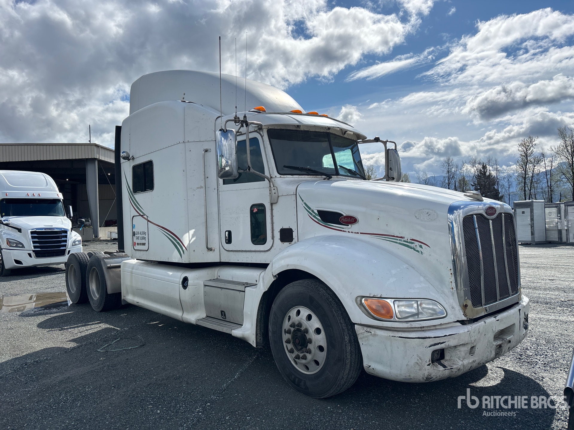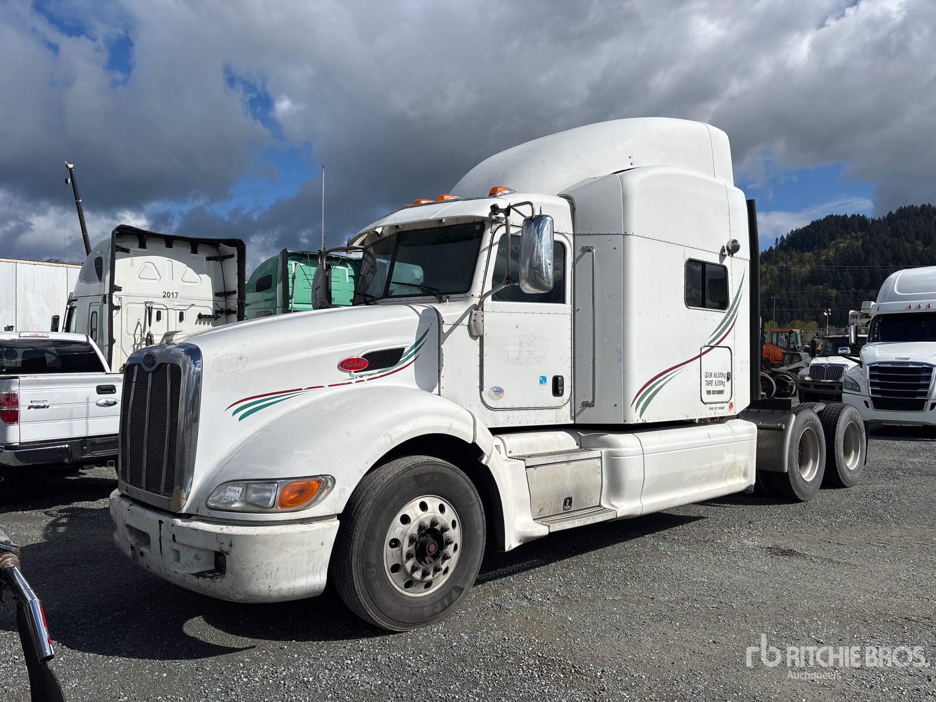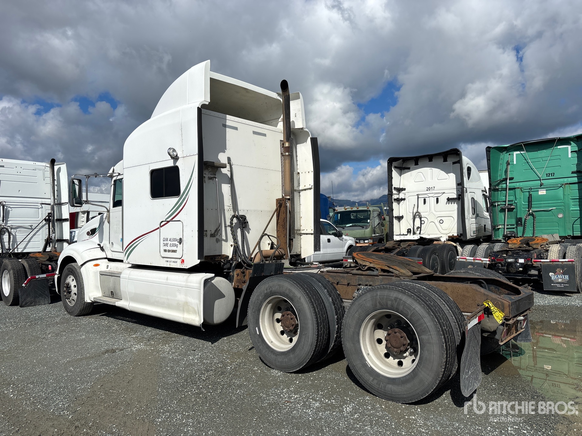 Cummins ISX15 525 hp Engine, 2011 US EPA Label, 10245 Engine hrs, Eaton Fuller 18-Speed Manual Transmission, 13200 lb Front Axle, 40000 lb Rears, 53200 lb GVWR, Double Differential Locks, 58 in Mid Roof Sleeper Cab, Bunk Heater, 241 in Wheelbase, Air Suspension, Aluminum Wheels, 11R22.5, Air Sliding 5th Wheel, Dual Fuel Tanks