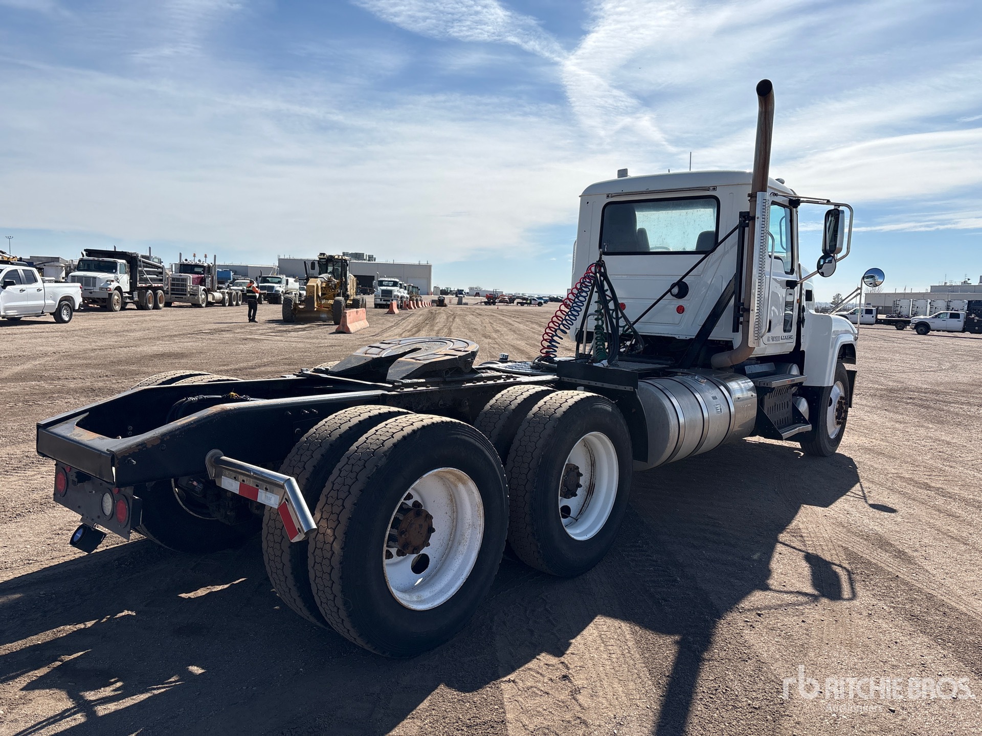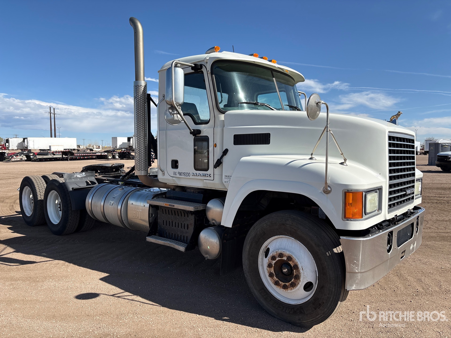 Located in Lane 10, Mack MP8 445 hp Engine, 2015 US EPA Label, Mack Maxitorque T318 18-Speed Manual Transmission 12000 lb Front Axle, 40000 lb Rears, 5000 lb GVWR, Engine Brake, 224 in Wheelbase, Camelback, 11R24.5 Front Tires, 11R24.5 Rear Tires, Wet Kit, Air Sliding 5th Wheel, Dual Fuel Tanks