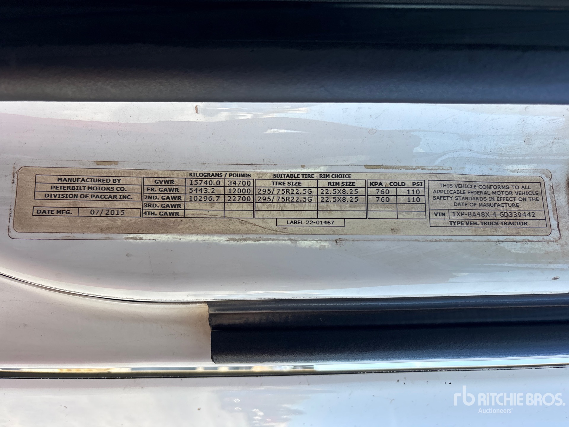 Cummins ISX15 400 hp Engine, 2015 US EPA Label, 15238 Engine hrs, 12000 lb Front Axle, 22700 lb Rears, 34700 lb GVWR, Engine Brake, 158 in Wheelbase, Air Suspension, 275/80R22.5 Front Tires, 275/80R22.5 Rear Tires, Air Sliding 5th Wheel, Dual Fuel Tanks