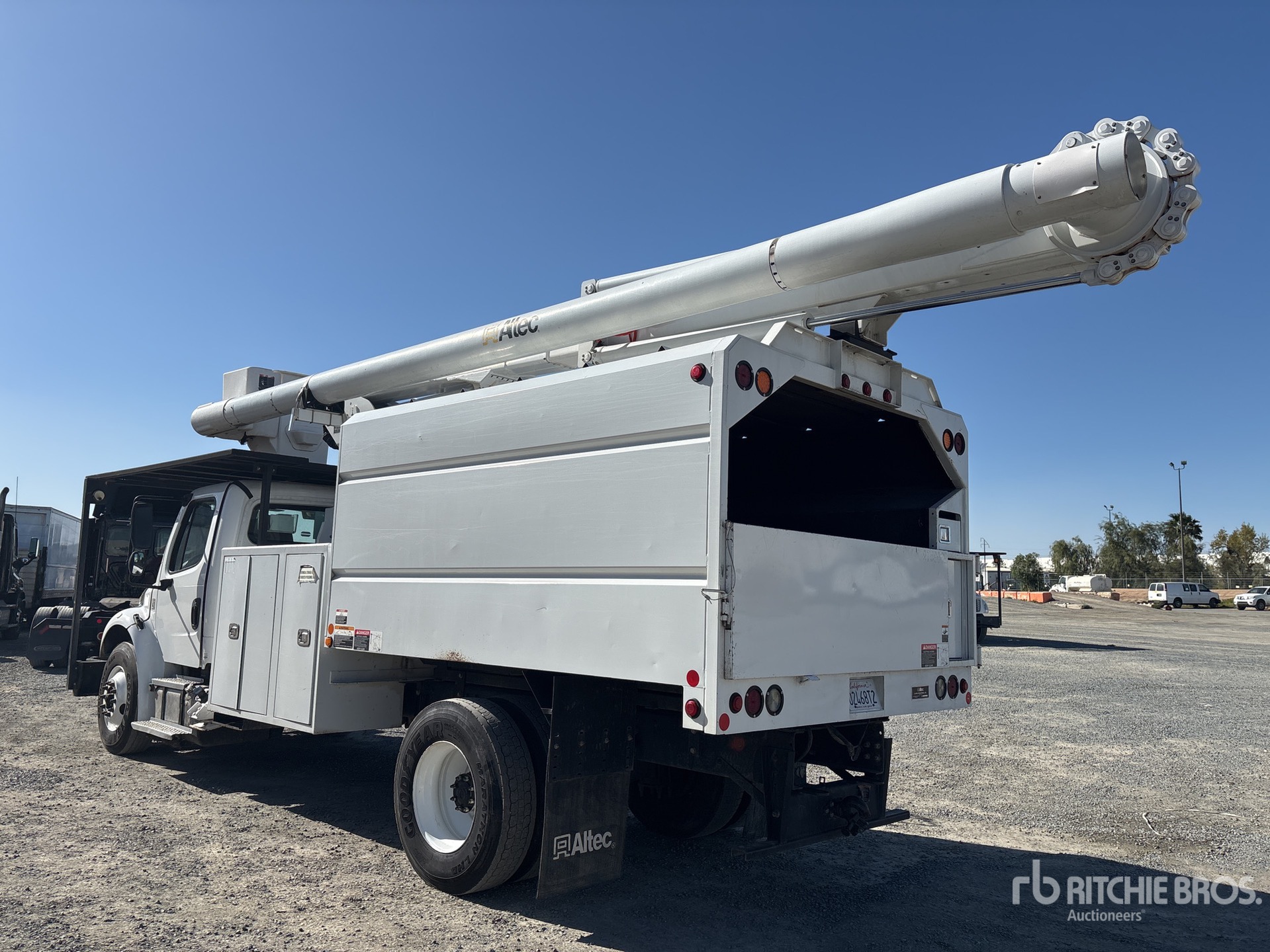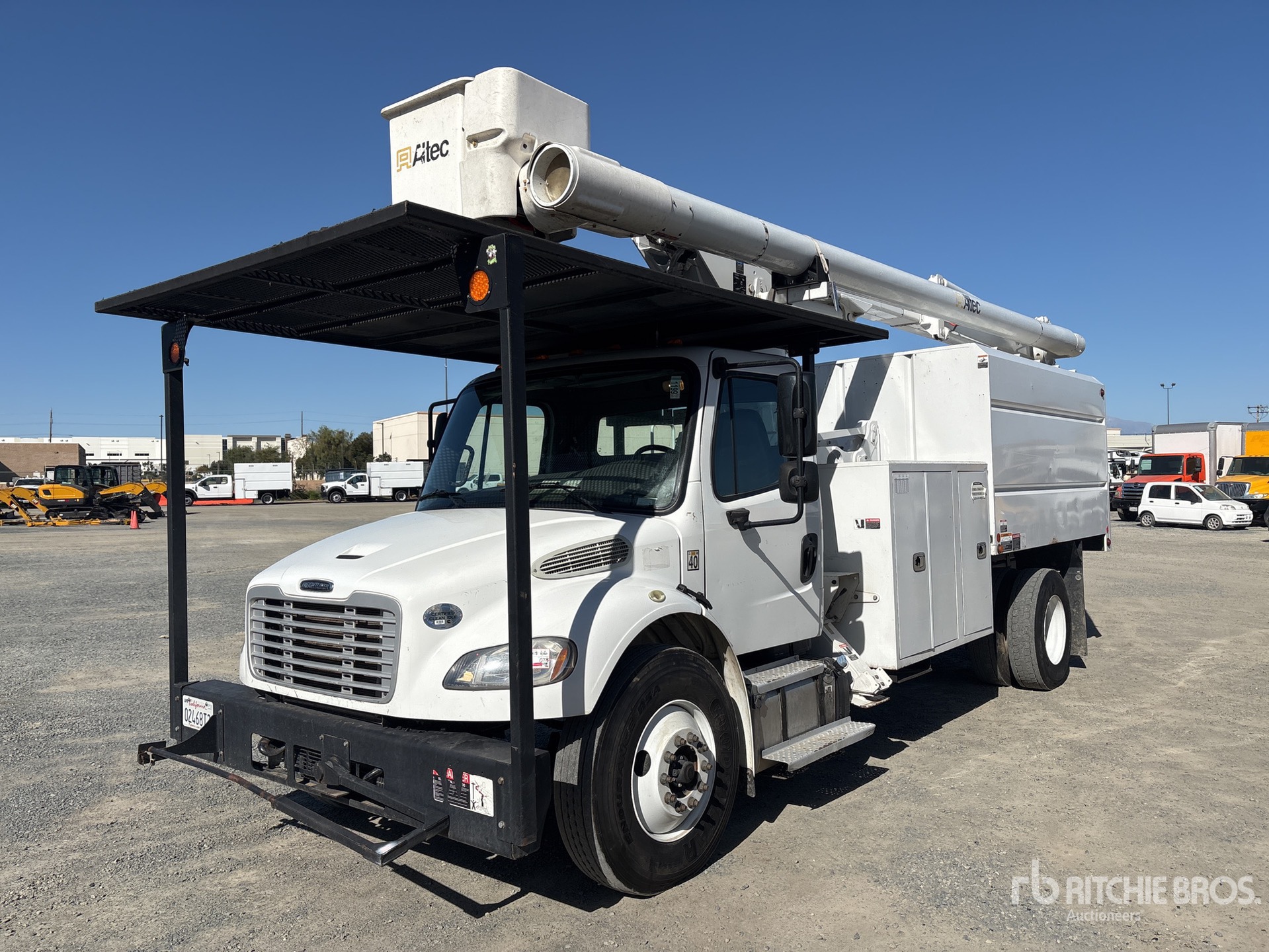 Located in Lane 11 Spot 13, Cummins ISB 6 Cylinder 6.7 L Diesel 250 hp Engine, 2017 US EPA Label, 5093 Engine hrs, Eaton Fuller FS-6406A 6-Speed Manual Transmission, 13220 lb Front Axle, 21000 lb Rears, Meritor MS-21-14X Drive Axles, 4.63:1 Axle Ratio, 3300 lb GVWR, 11R22.5, Spring Suspension, 208 in Wheelbase, 400 lb Capacity, Front Mounted, Insulated One-Person Articulated Boom, Lower Boom Fiberglass Insert, Chip Body, A-Outriggers, 11 ft x 96 in Bed, Pintle Hitch, Equipment-from-Mowbrays-Tree-Service