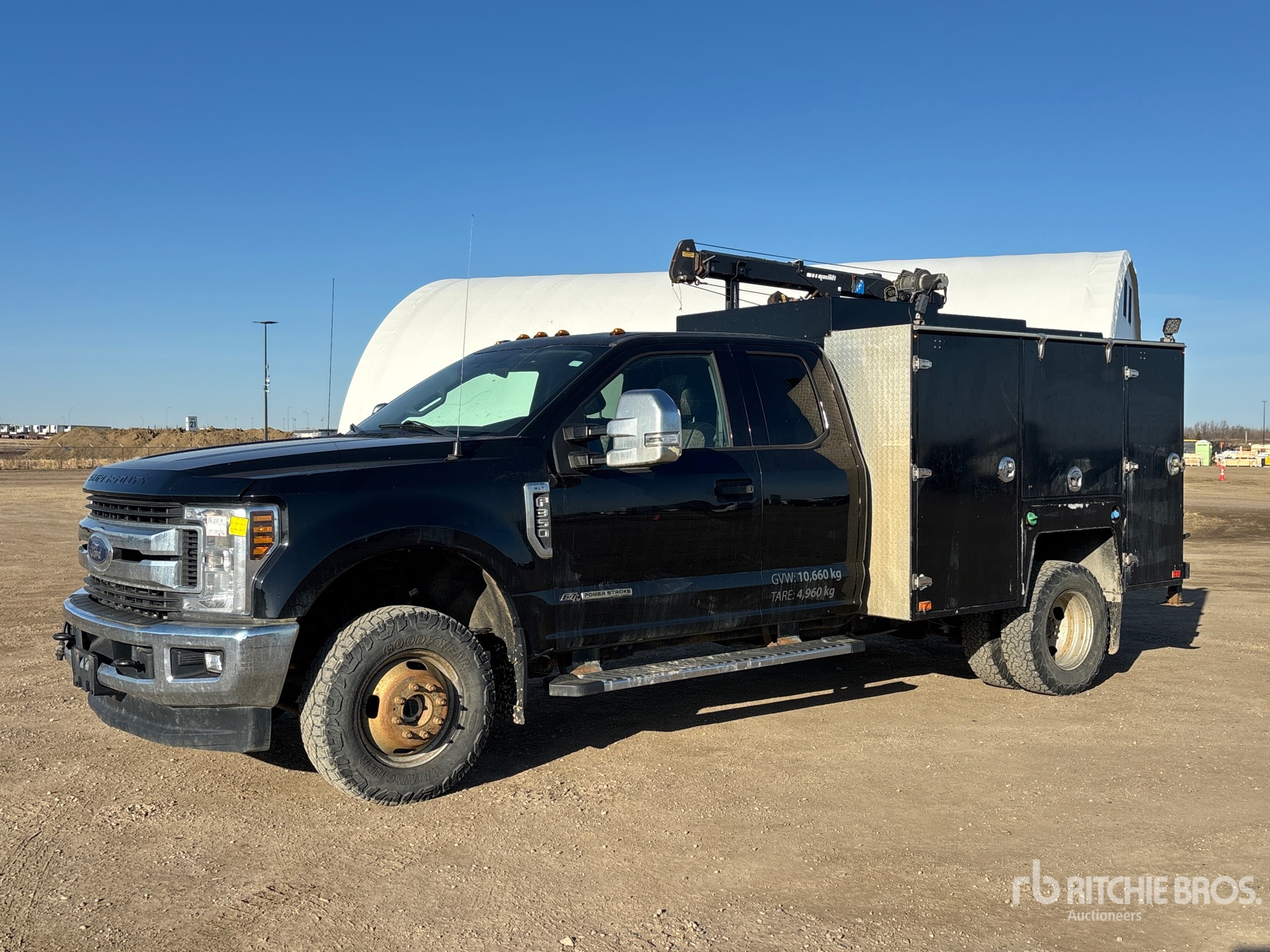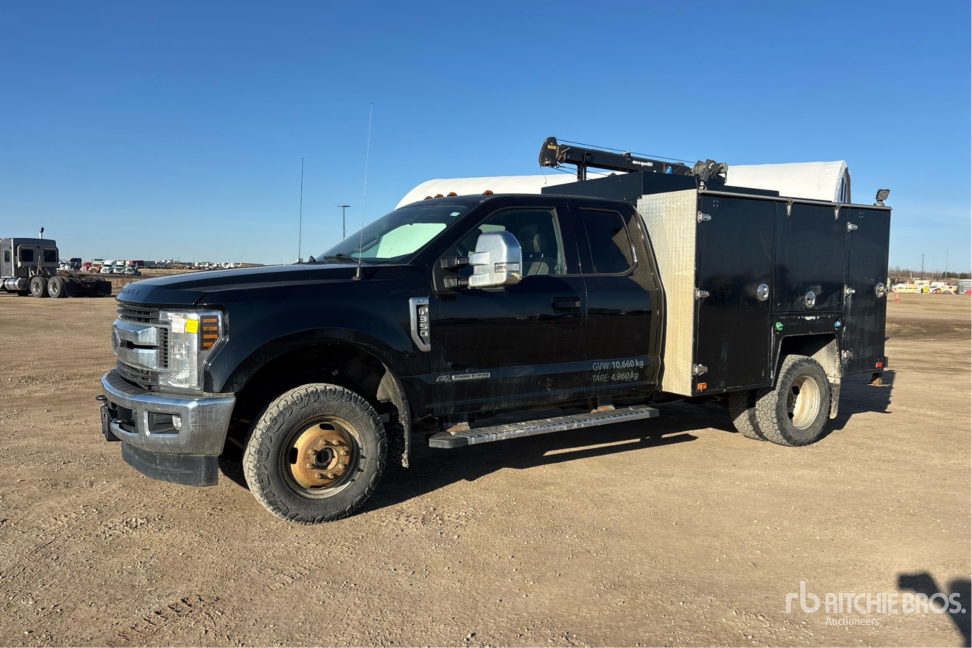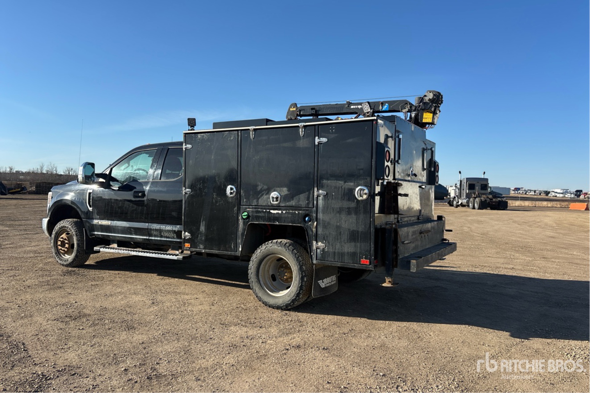 V8 6.7 L Diesel Engine, Exhaust Brake, Automatic Transmission, 5990 lb Front Axle, 9900 lb Rears, 14000 lb GVWR, 245/75R17, Spring Suspension, 164 in Wheelbase, 8 ft 5 in Body, Maxilift 3 Section Hydraulic Crane, Wired Remote Control, Ingersoll-Rand 2475 Air Compressor, Air Hose Reel
