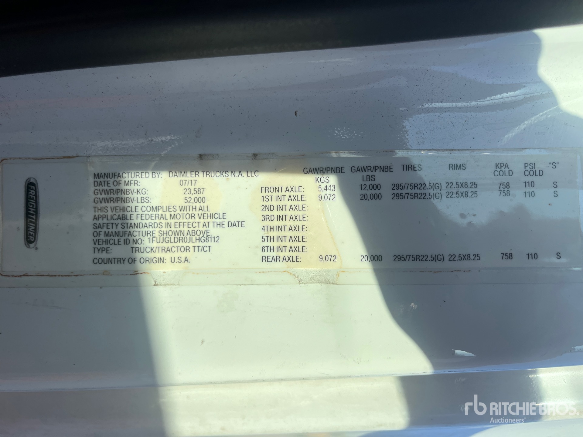 Located in Lane 65 Spot 3, Detroit DD15 400 hp Engine, 2017 US EPA Label, Detroit DT12-DA-1750 12-Speed Automated Transmission, 12000 lb Front Axle, 20000 lb Rears, 52000 lb GVWR, Engine Brake, Differential Lock, 72 in High Rise Sleeper Cab, Bunk Beds, 227 in Wheelbase, Air Suspension, Aluminum Wheels, 295/75R22.5, Air Sliding 5th Wheel, Dual Fuel Tanks