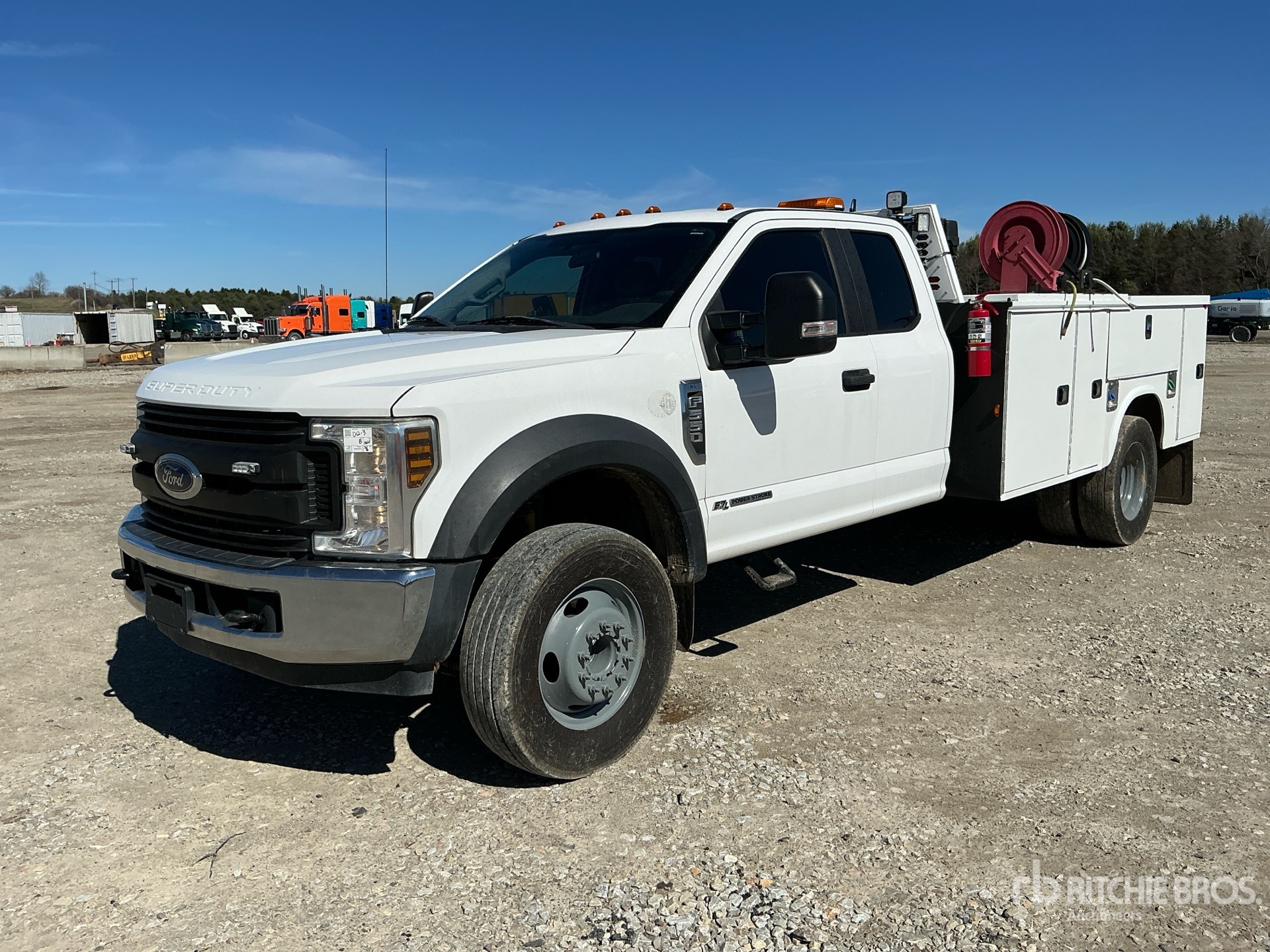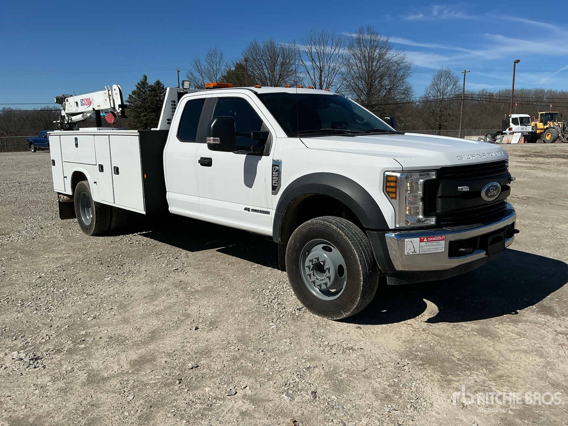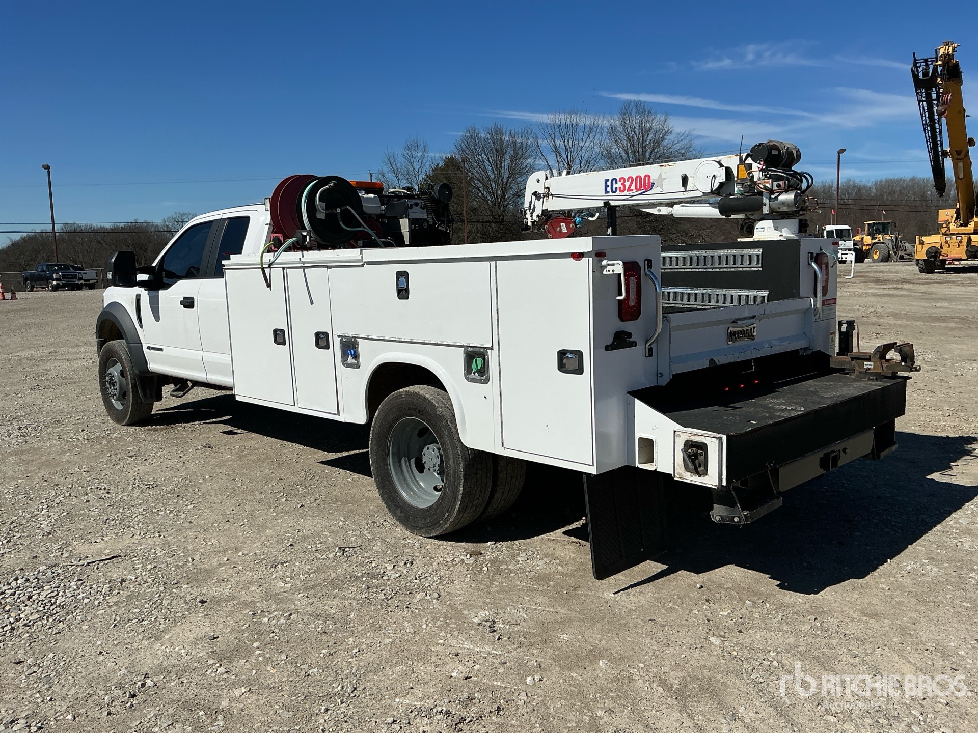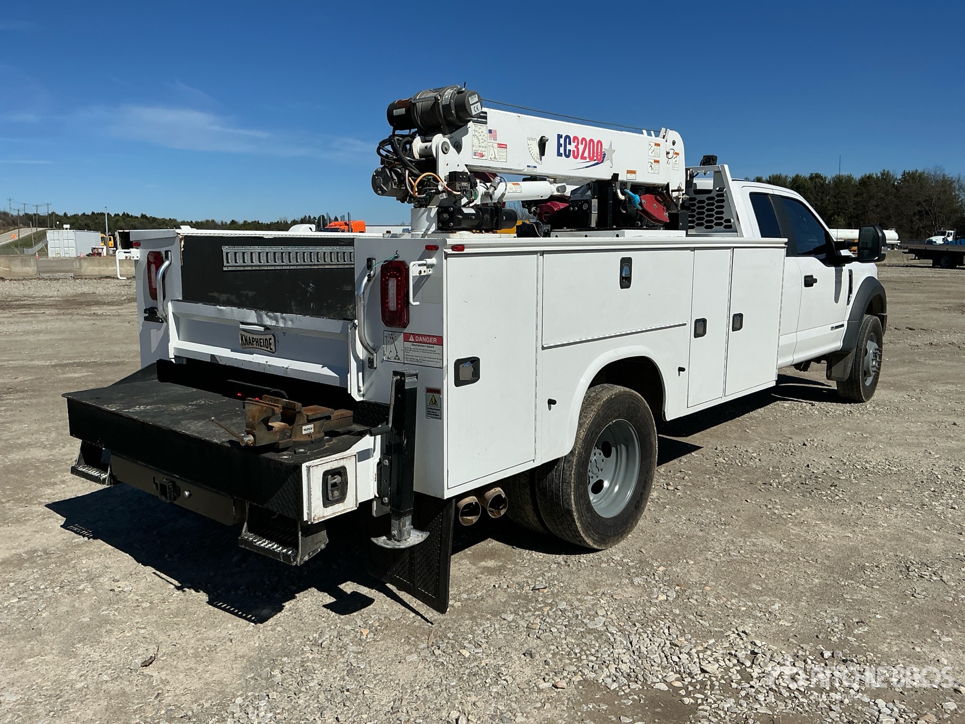Ford Powerstroke V8 6.7 L Diesel 330 hp Engine, 2019 US EPA Label, CARB Compliant, Requires Diesel Exhaust Fluid, Automatic Transmission, 7000 lb Front Axle, 14706 lb Rears, 225/70R19.5, Spring Suspension, 193 in Wheelbase, 2019 Knapheide 13 ft Body, Manual Stabilizers, 2019 Stellar EC3200 3200 lb 3 Section Electric Crane, Wireless Remote Control, CAS Gasoline Air Compressor, Air Hose Reel, Sincro Powell 240 A Gasoline Welder, Air Compressor, Outriggers, Wireless Remote