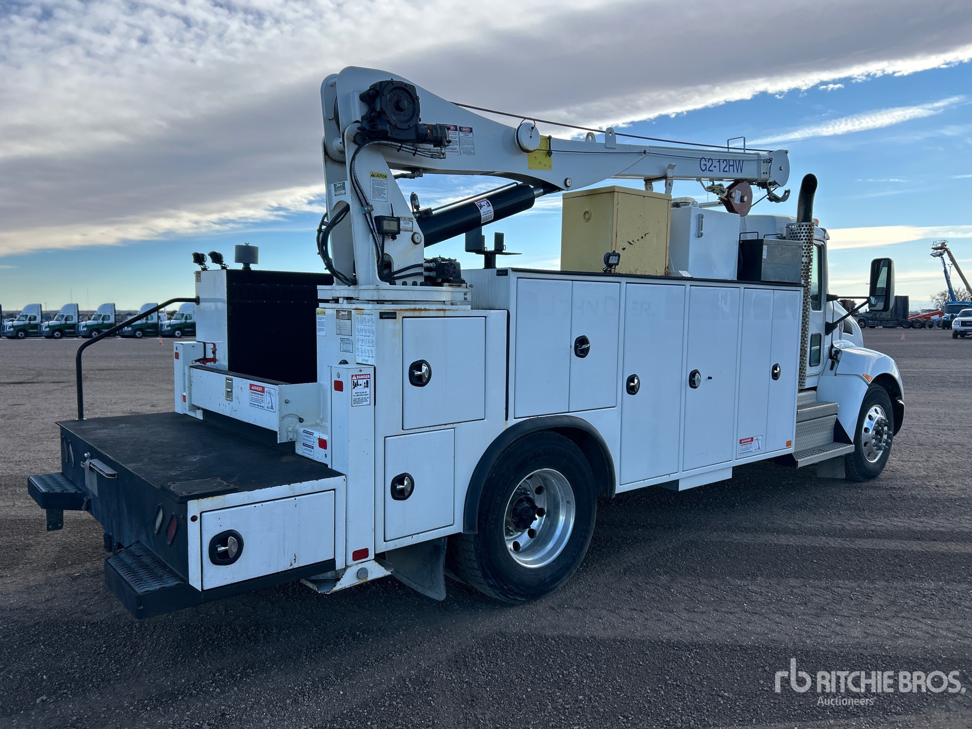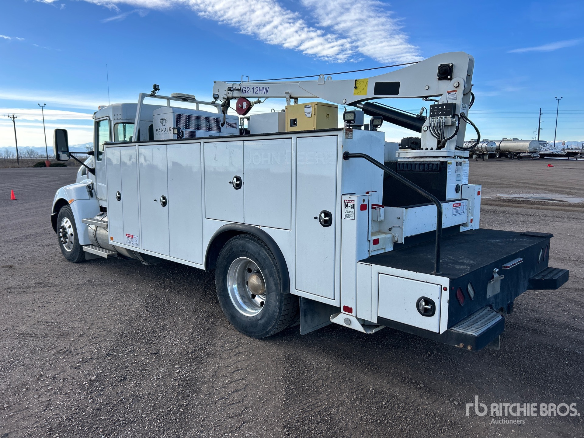Paccar PX-9 6 Cylinder 8.9 L Diesel 260 hp Engine, 2019 US EPA Label, 10670 Engine hrs, Allison 3000 Automatic Transmission, 12000 lb Front Axle, 21000 lb Rears, Meritor MS-21-14x4 Drive Axles, 5.29:1 Axle Ratio, 33000 lb GVWR, Aluminum Wheels, 11R22.5, Air Ride Suspension, 192 in Wheelbase, PTO, 16 ft 6 in Body, Hydraulic Stabilizers, Feterl G2-12HW 12000 lb 2 Section Hydraulic Crane, Vanair I-300 Diesel 3-in-1 Welder