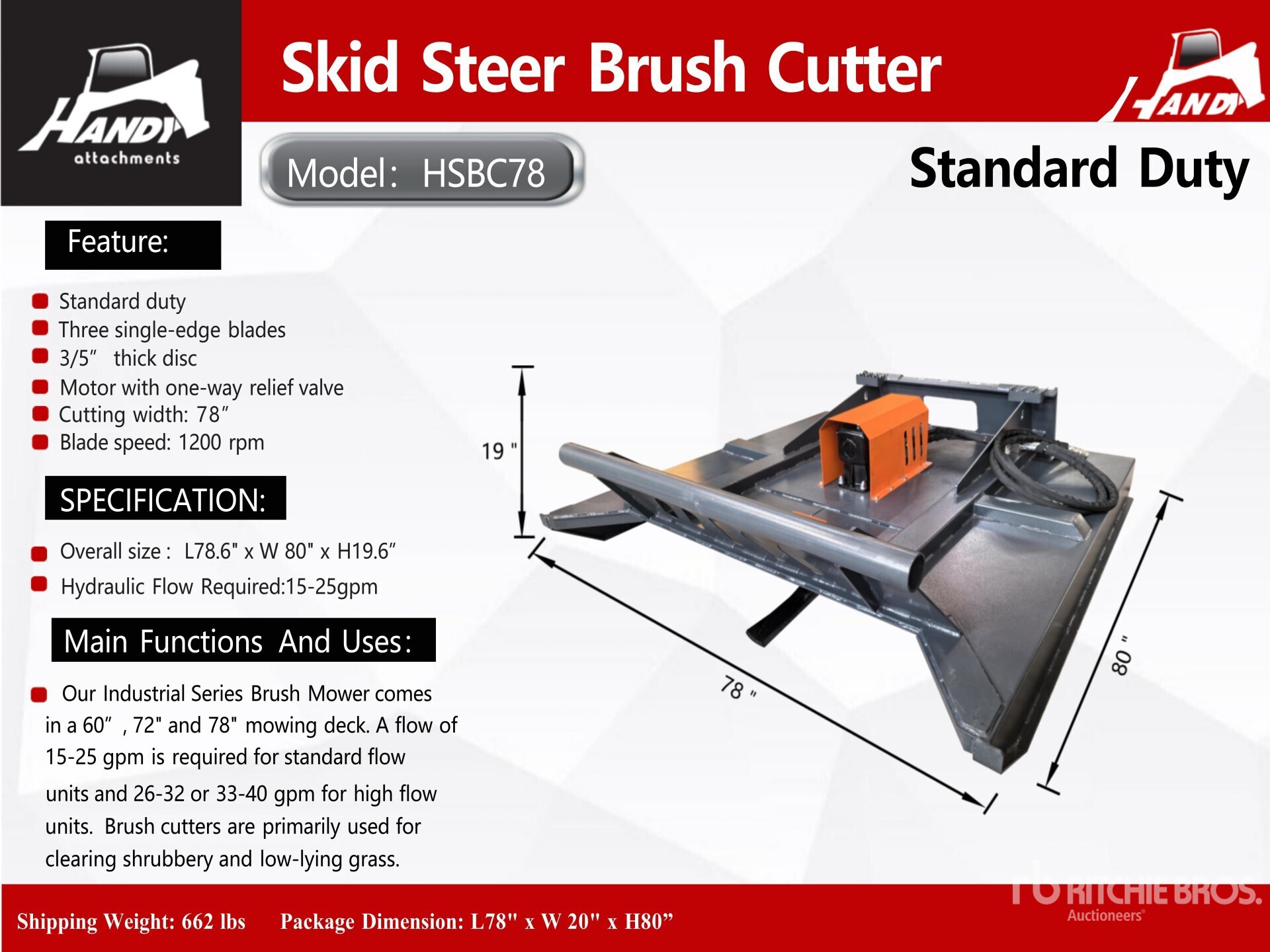 The detailed equipment information is limited in scope, and Ritchie Bros. Auctioneers has not inspected any aspects or components of the equipment other than those expressly set forth herein. Unless expressly stated, we make no representations or warranties, express or implied, concerning the equipment or its components, including without limitation any representations or warranties concerning functionality, conformity or compliance with any safety standard or requirement of any applicable authority or regulatory body, fitness for any particular purpose, or merchantability. You are strongly advised to perform your own detailed inspection of the equipment prior to bidding.
