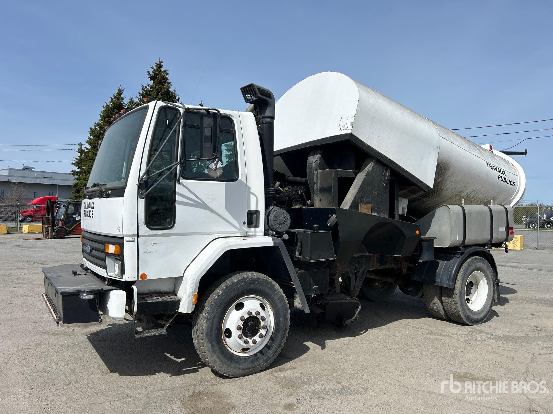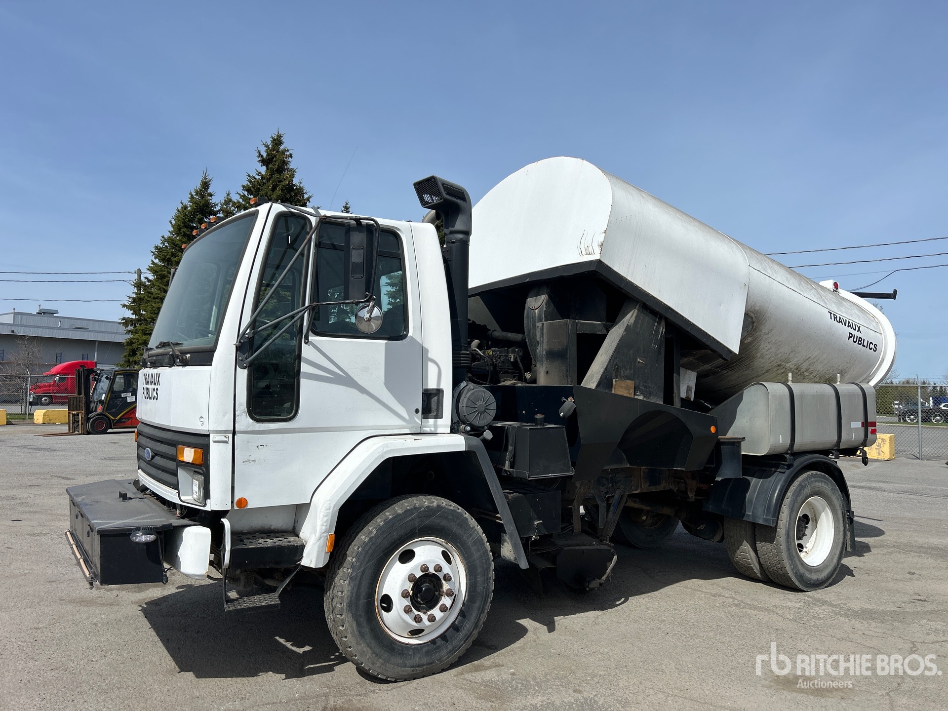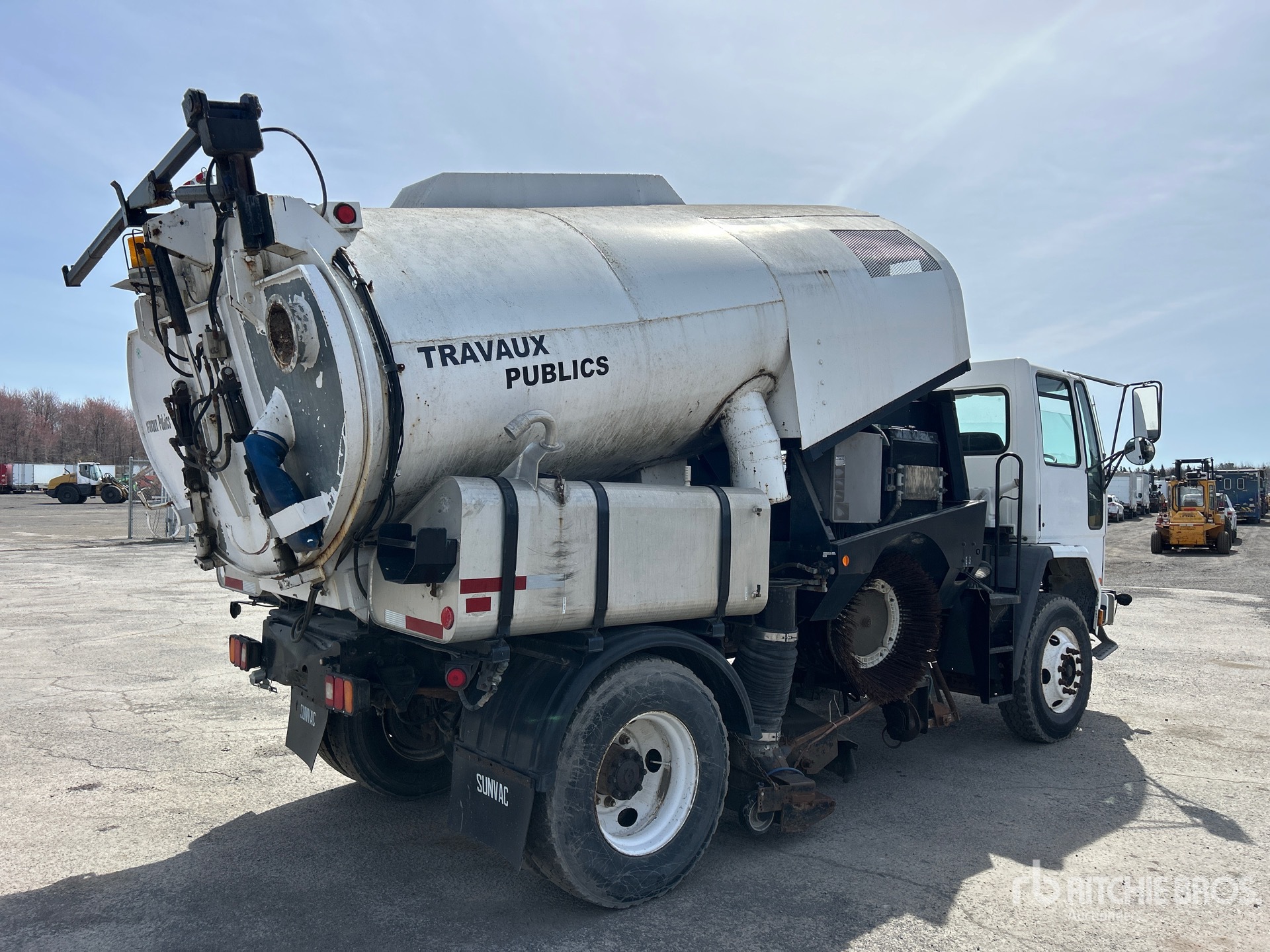 Automatic Transmission, 12000 lb Front Axle, 21000 lb Rears, 32000 lb GVWR, 11R22.5, Spring Suspension, 153 in Wheelbase, John Deere Auxiliary Engine, Vacuum Sweeper, Dual Controls, Front Spray Bar, 60 in, Gutter Brooms, Water System, Hydraulic Dump